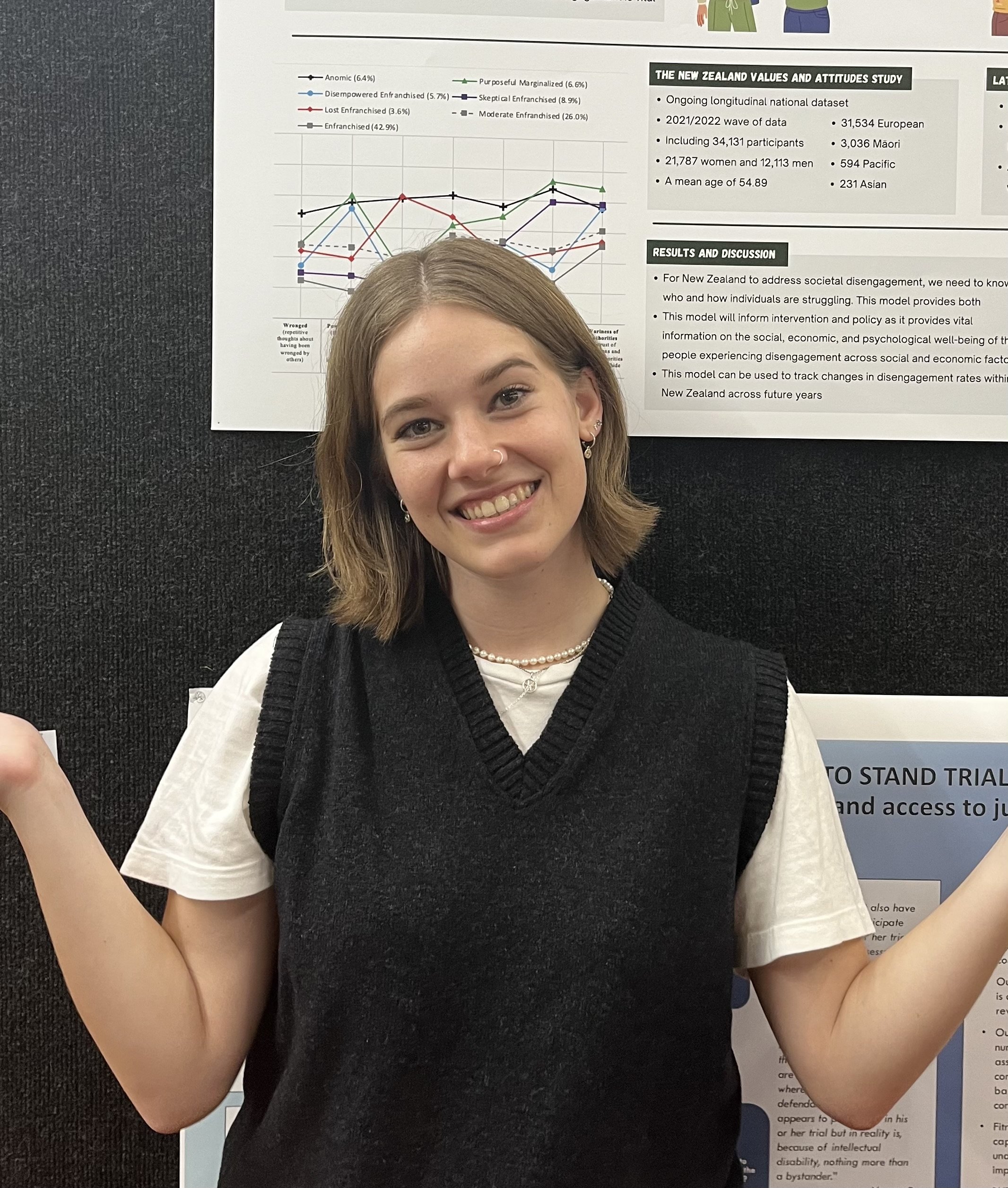 Kia ora! I completed my Bachelor of Science (Honours) in 2023 at the University of Auckland. My research utilised the NZAVS to explore how societal disconnection appears in Aotearoa and who is most affected by it.